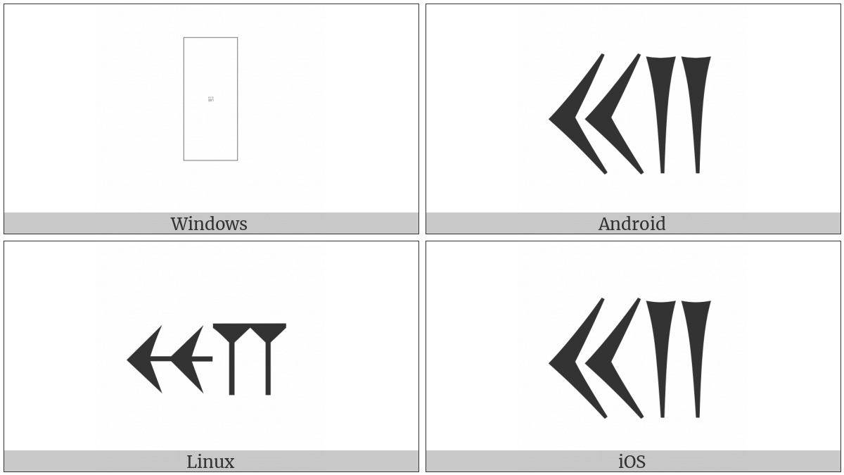 The image below shows how the “Old Persian Sign Xa” symbol might look like on different operating systems. If the font in which this web site is displayed does not contain the symbol and there is no fallback font able to render it, you can use the image below to get an idea of what it should look like.
