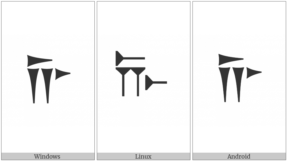 The image below shows how the “Old Persian Sign Ca” symbol might look like on different operating systems. If the font in which this web site is displayed does not contain the symbol and there is no fallback font able to render it, you can use the image below to get an idea of what it should look like.