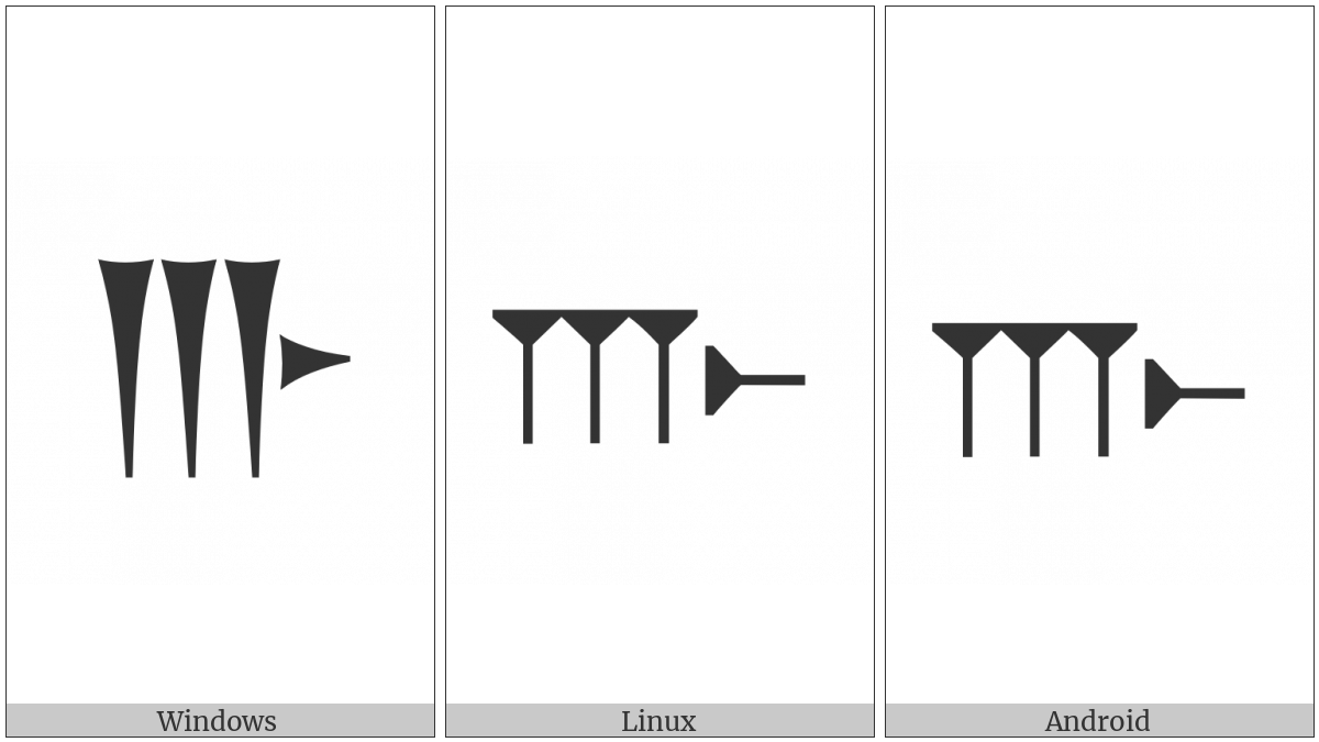 The image below shows how the “Old Persian Sign Tu” symbol might look like on different operating systems. If the font in which this web site is displayed does not contain the symbol and there is no fallback font able to render it, you can use the image below to get an idea of what it should look like.
