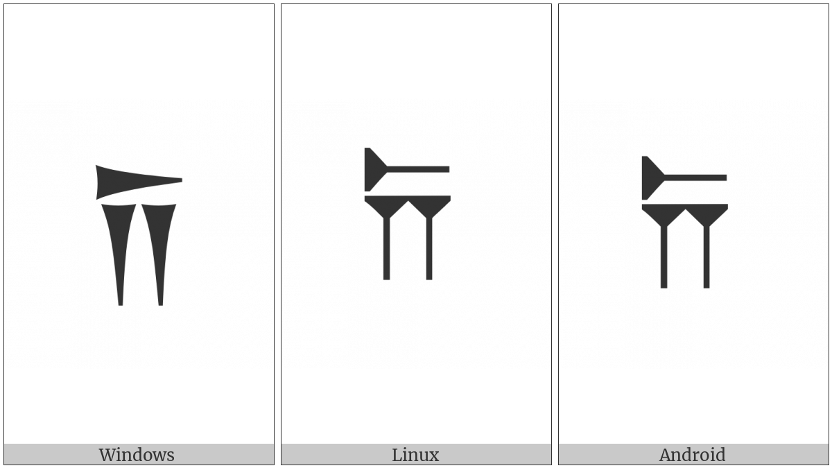 The image below shows how the “Old Persian Sign Da” symbol might look like on different operating systems. If the font in which this web site is displayed does not contain the symbol and there is no fallback font able to render it, you can use the image below to get an idea of what it should look like.