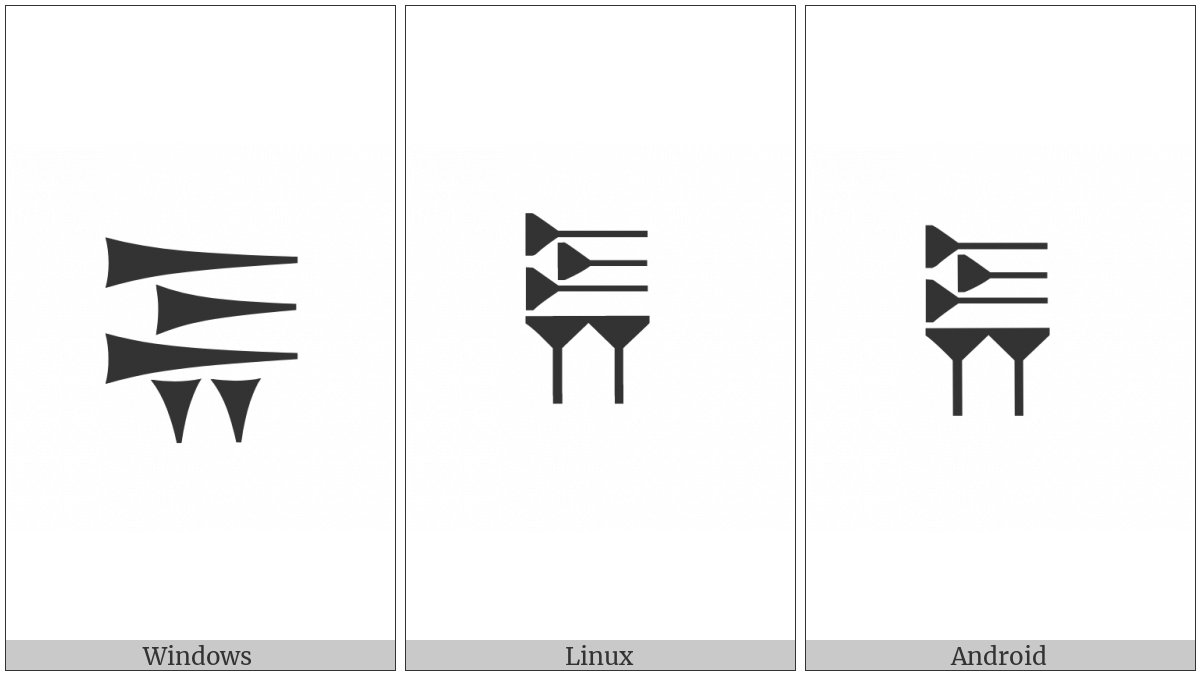 The image below shows how the “Old Persian Sign Pa” symbol might look like on different operating systems. If the font in which this web site is displayed does not contain the symbol and there is no fallback font able to render it, you can use the image below to get an idea of what it should look like.