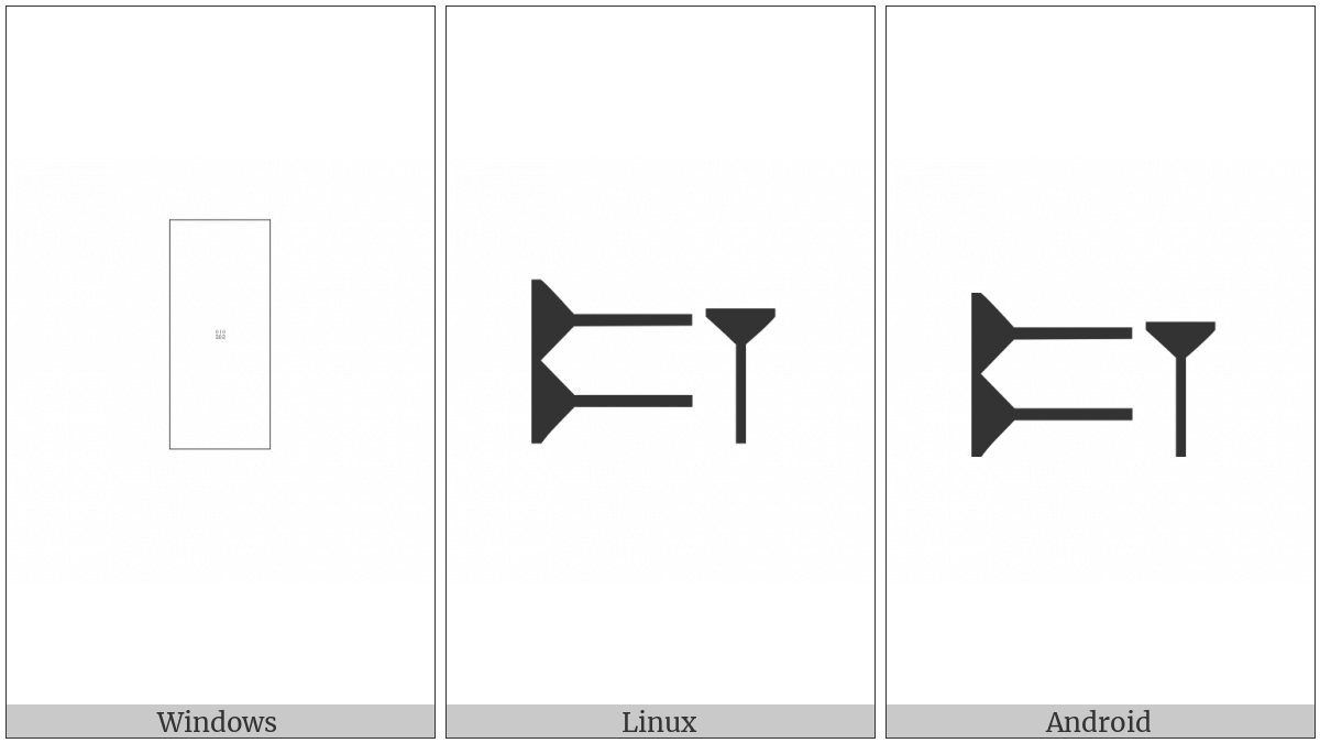 The image below shows how the “Old Persian Sign Ba” symbol might look like on different operating systems. If the font in which this web site is displayed does not contain the symbol and there is no fallback font able to render it, you can use the image below to get an idea of what it should look like.