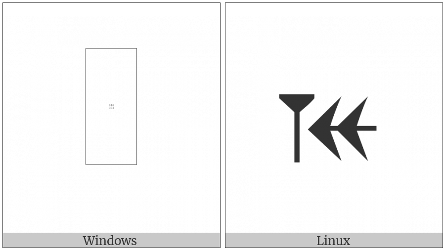 The image below shows how the “Old Persian Sign Fa” symbol might look like on different operating systems. If the font in which this web site is displayed does not contain the symbol and there is no fallback font able to render it, you can use the image below to get an idea of what it should look like.