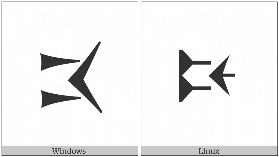 The image below shows how the “Old Persian Sign Na” symbol might look like on different operating systems. If the font in which this web site is displayed does not contain the symbol and there is no fallback font able to render it, you can use the image below to get an idea of what it should look like.