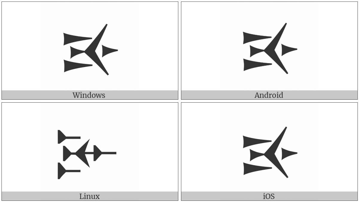 The image below shows how the “Old Persian Sign Mu” symbol might look like on different operating systems. If the font in which this web site is displayed does not contain the symbol and there is no fallback font able to render it, you can use the image below to get an idea of what it should look like.