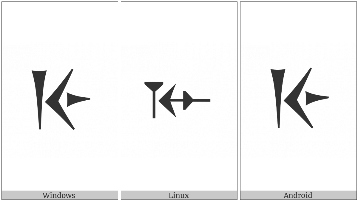 The image below shows how the “Old Persian Sign Ya” symbol might look like on different operating systems. If the font in which this web site is displayed does not contain the symbol and there is no fallback font able to render it, you can use the image below to get an idea of what it should look like.