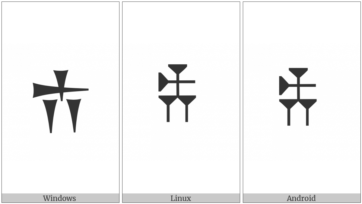 The image below shows how the “Old Persian Sign Vi” symbol might look like on different operating systems. If the font in which this web site is displayed does not contain the symbol and there is no fallback font able to render it, you can use the image below to get an idea of what it should look like.