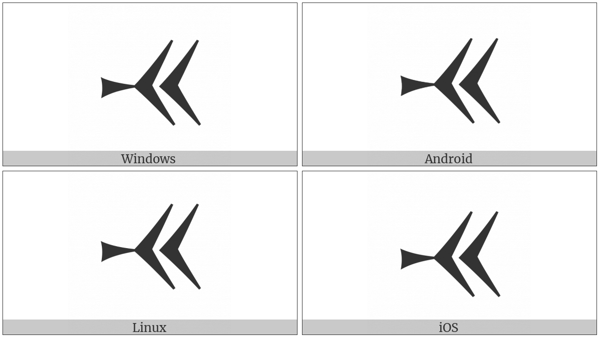The image below shows how the “Old Persian Sign Ru” symbol might look like on different operating systems. If the font in which this web site is displayed does not contain the symbol and there is no fallback font able to render it, you can use the image below to get an idea of what it should look like.