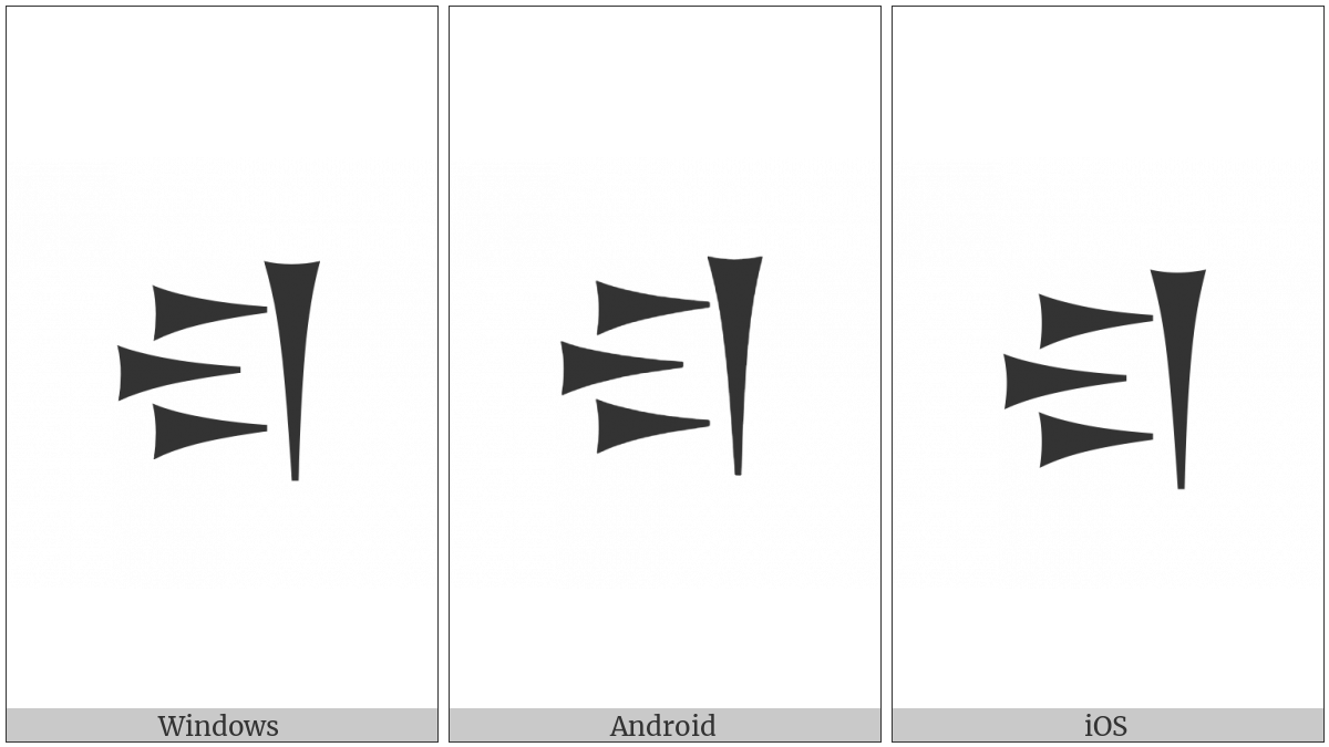 The image below shows how the “Old Persian Sign La” symbol might look like on different operating systems. If the font in which this web site is displayed does not contain the symbol and there is no fallback font able to render it, you can use the image below to get an idea of what it should look like.