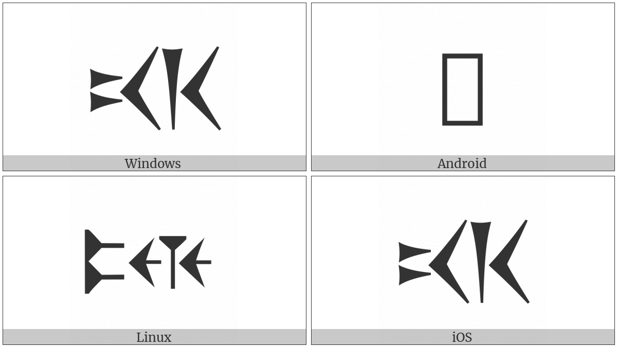 The image below shows how the “Old Persian Sign Xshaayathiya” symbol might look like on different operating systems. If the font in which this web site is displayed does not contain the symbol and there is no fallback font able to render it, you can use the image below to get an idea of what it should look like.