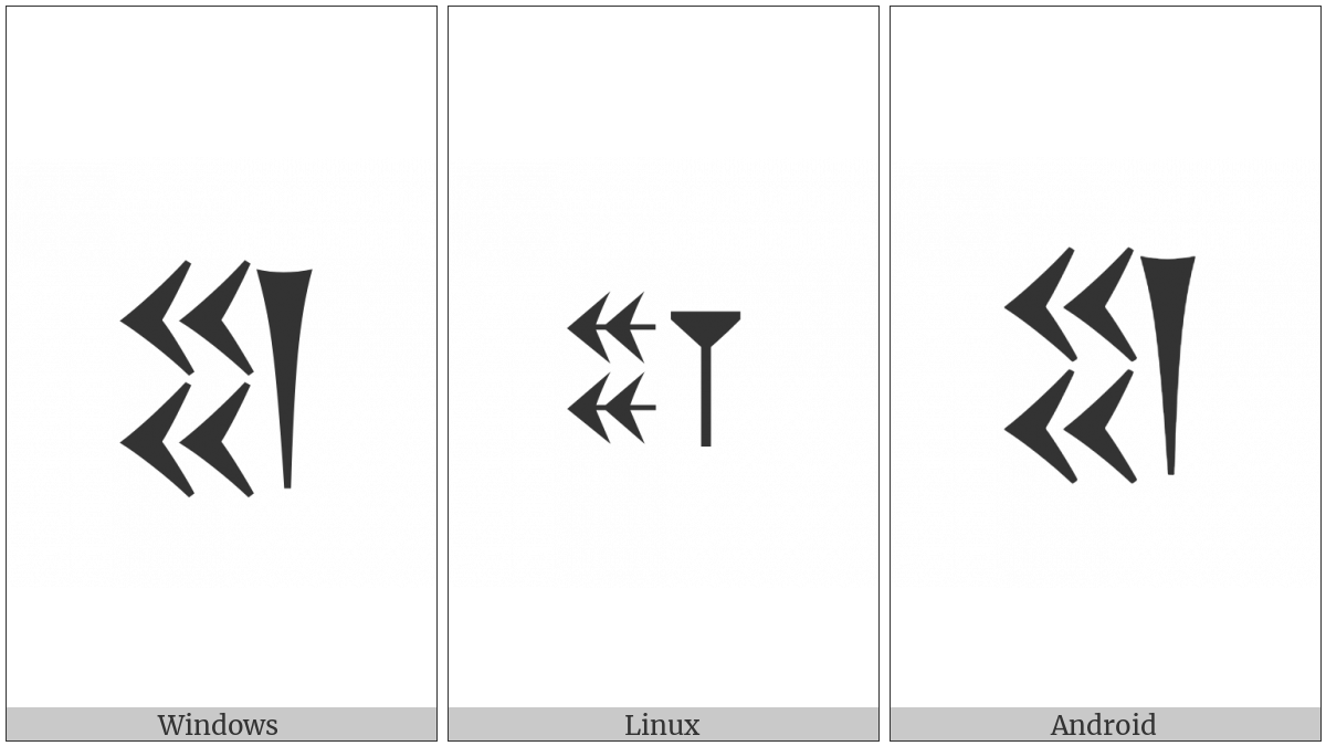 The image below shows how the “Old Persian Sign Dahyaaush” symbol might look like on different operating systems. If the font in which this web site is displayed does not contain the symbol and there is no fallback font able to render it, you can use the image below to get an idea of what it should look like.