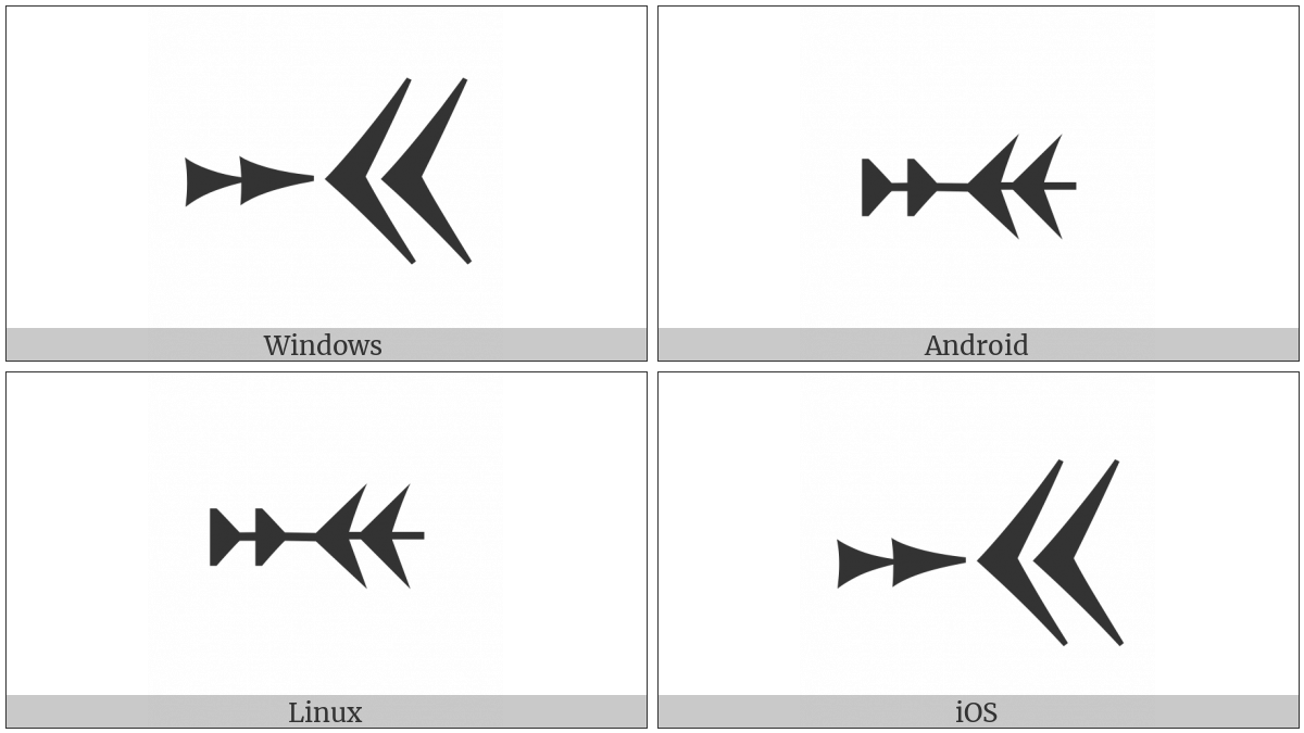 The image below shows how the “Old Persian Sign Baga” symbol might look like on different operating systems. If the font in which this web site is displayed does not contain the symbol and there is no fallback font able to render it, you can use the image below to get an idea of what it should look like.