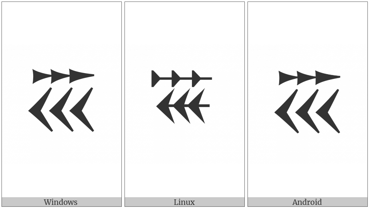 The image below shows how the “Old Persian Sign Buumish” symbol might look like on different operating systems. If the font in which this web site is displayed does not contain the symbol and there is no fallback font able to render it, you can use the image below to get an idea of what it should look like.