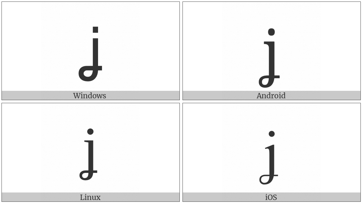 The image below shows how the “Latin Small Letter J With Crossed-Tail” symbol might look like on different operating systems. If the font in which this web site is displayed does not contain the symbol and there is no fallback font able to render it, you can use the image below to get an idea of what it should look like.