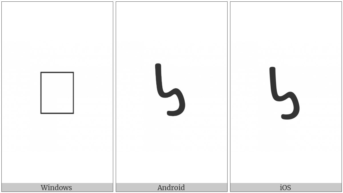 The image below shows how the “Palmyrene Letter Lamedh” symbol might look like on different operating systems. If the font in which this web site is displayed does not contain the symbol and there is no fallback font able to render it, you can use the image below to get an idea of what it should look like.