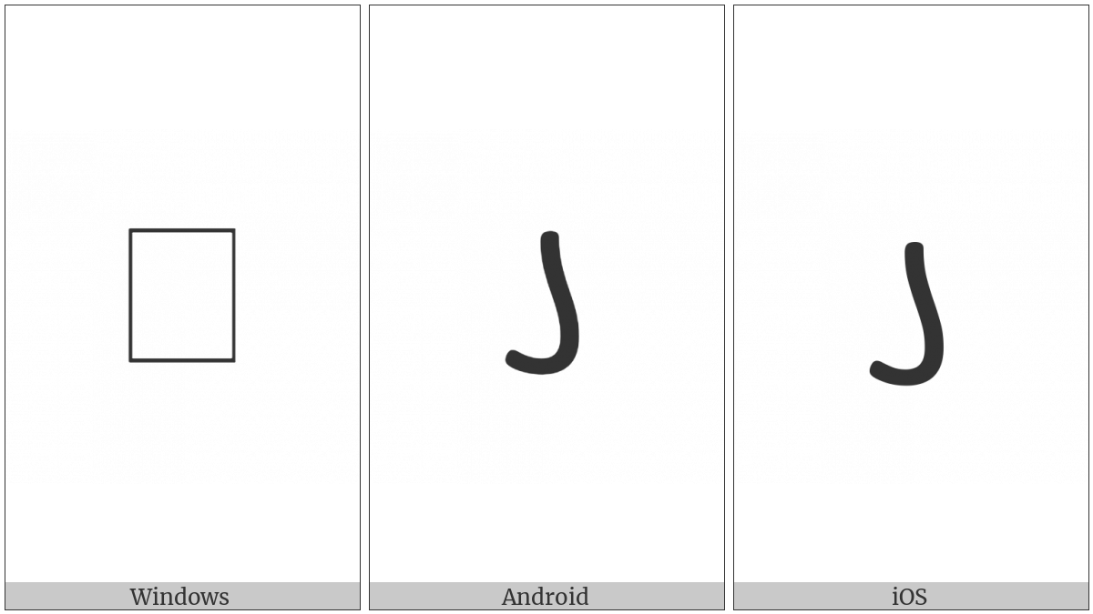 The image below shows how the “Palmyrene Letter Nun” symbol might look like on different operating systems. If the font in which this web site is displayed does not contain the symbol and there is no fallback font able to render it, you can use the image below to get an idea of what it should look like.
