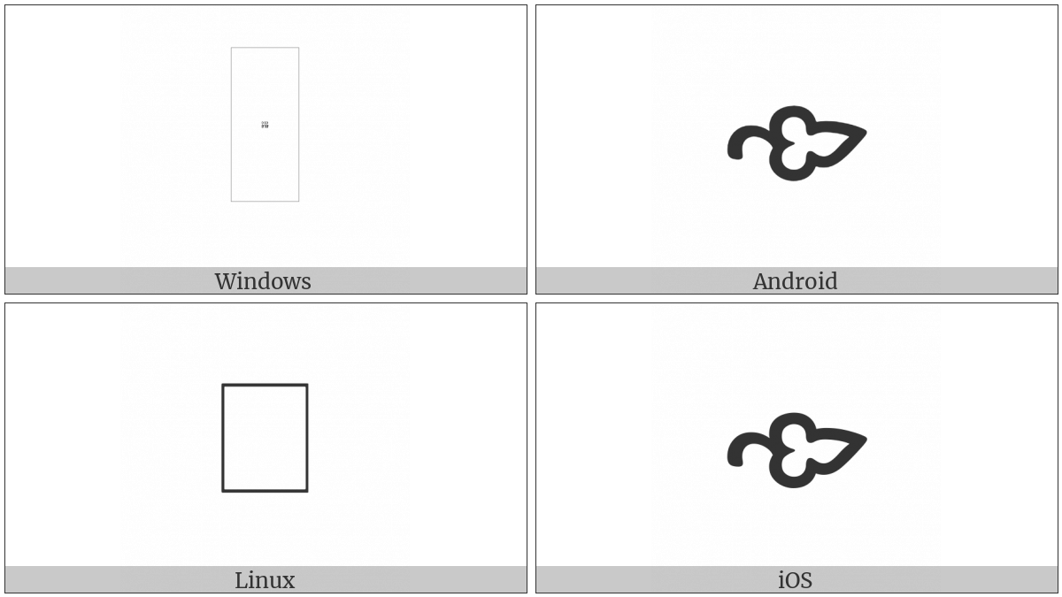The image below shows how the “Palmyrene Right-Pointing Fleuron” symbol might look like on different operating systems. If the font in which this web site is displayed does not contain the symbol and there is no fallback font able to render it, you can use the image below to get an idea of what it should look like.