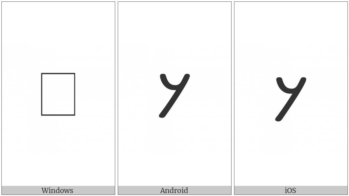 The image below shows how the “Palmyrene Number Five” symbol might look like on different operating systems. If the font in which this web site is displayed does not contain the symbol and there is no fallback font able to render it, you can use the image below to get an idea of what it should look like.