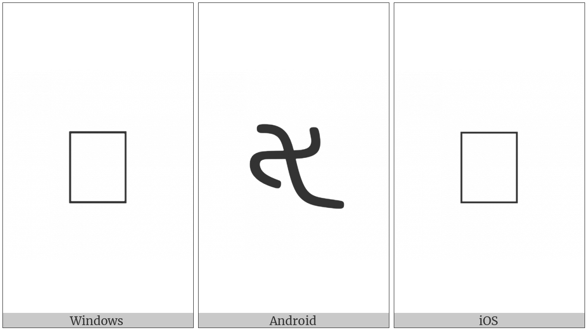 The image below shows how the “Nabataean Letter Final Aleph” symbol might look like on different operating systems. If the font in which this web site is displayed does not contain the symbol and there is no fallback font able to render it, you can use the image below to get an idea of what it should look like.