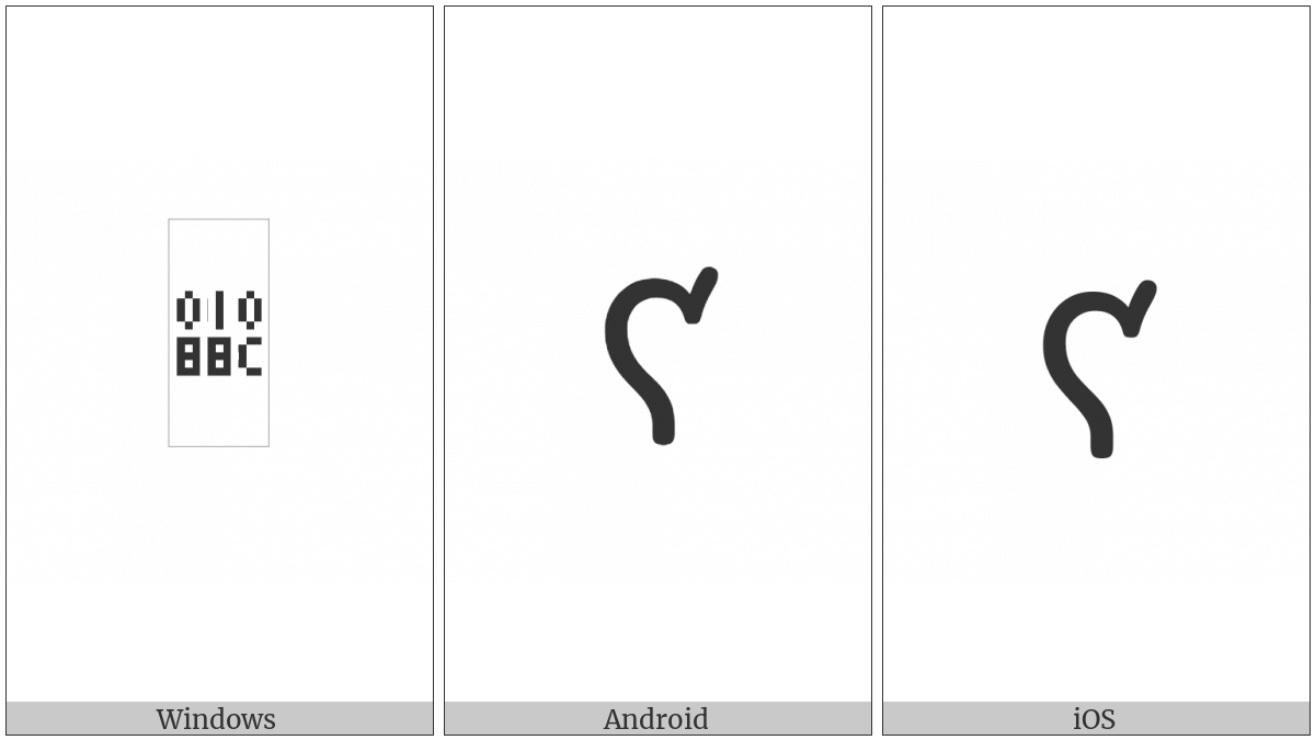 The image below shows how the “Nabataean Letter Final Yodh” symbol might look like on different operating systems. If the font in which this web site is displayed does not contain the symbol and there is no fallback font able to render it, you can use the image below to get an idea of what it should look like.