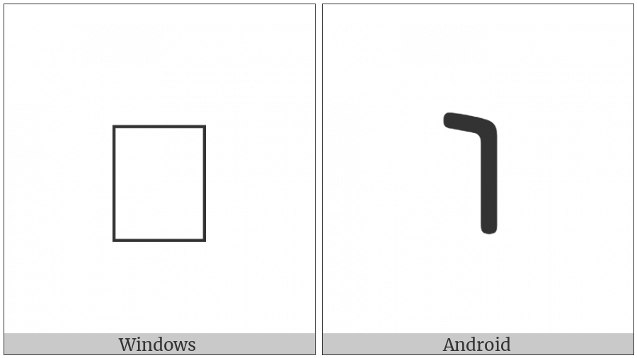 The image below shows how the “Nabataean Letter Resh” symbol might look like on different operating systems. If the font in which this web site is displayed does not contain the symbol and there is no fallback font able to render it, you can use the image below to get an idea of what it should look like.