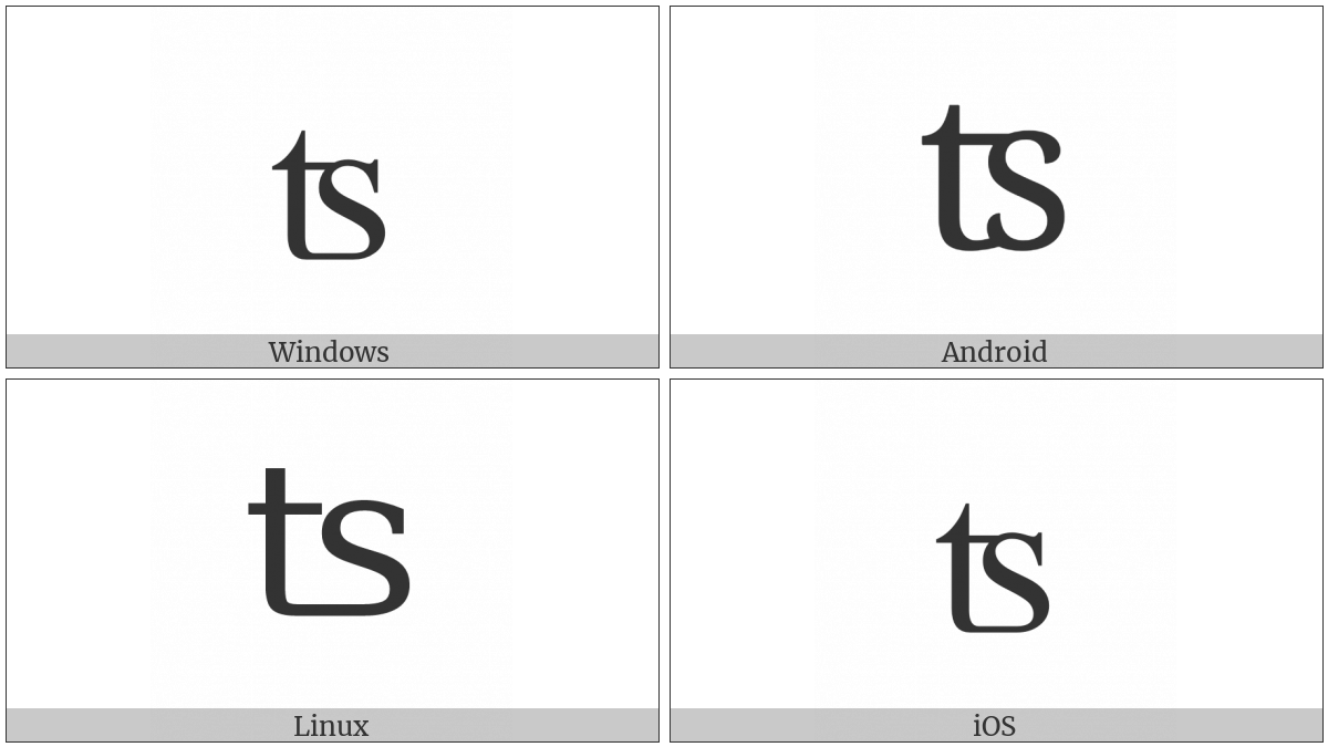The image below shows how the “Latin Small Letter Ts Digraph” symbol might look like on different operating systems. If the font in which this web site is displayed does not contain the symbol and there is no fallback font able to render it, you can use the image below to get an idea of what it should look like.