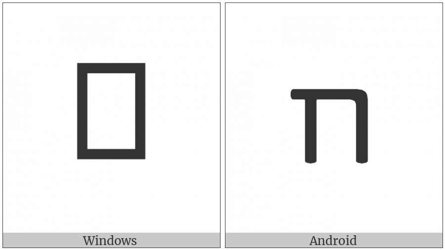 The image below shows how the “Hatran Letter Qoph” symbol might look like on different operating systems. If the font in which this web site is displayed does not contain the symbol and there is no fallback font able to render it, you can use the image below to get an idea of what it should look like.