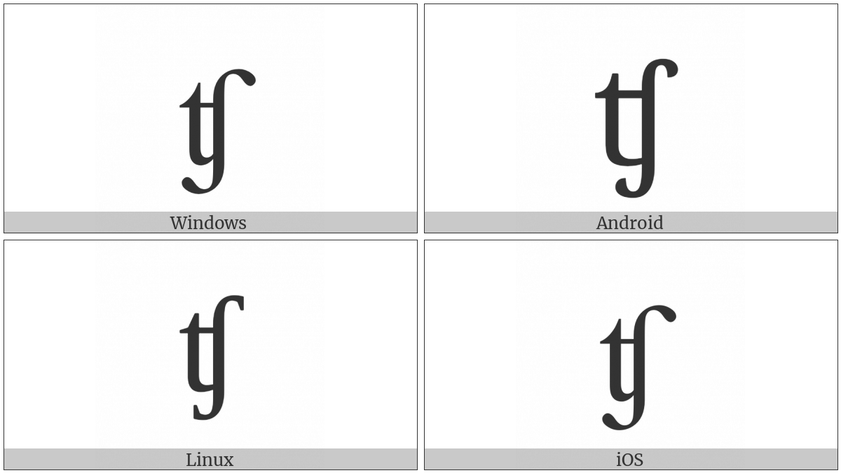 The image below shows how the “Latin Small Letter Tesh Digraph” symbol might look like on different operating systems. If the font in which this web site is displayed does not contain the symbol and there is no fallback font able to render it, you can use the image below to get an idea of what it should look like.