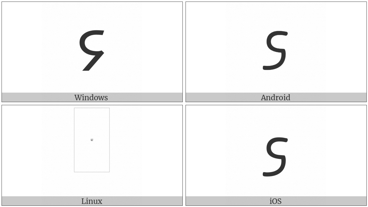 The image below shows how the “Meroitic Cursive Letter E” symbol might look like on different operating systems. If the font in which this web site is displayed does not contain the symbol and there is no fallback font able to render it, you can use the image below to get an idea of what it should look like.