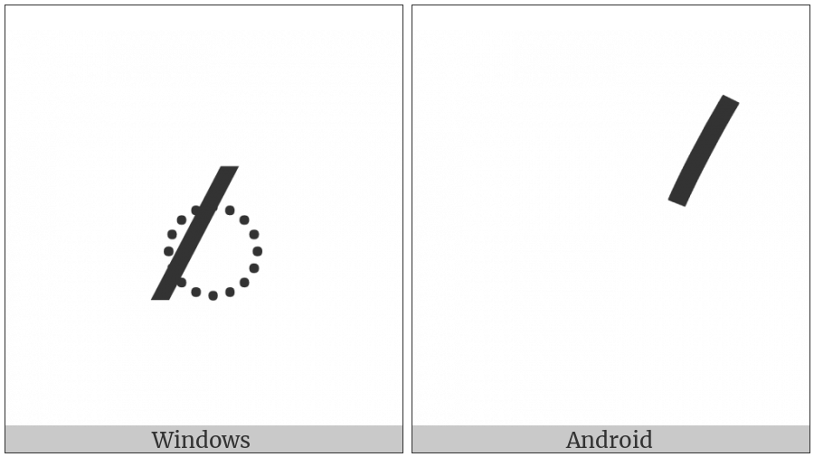The image below shows how the “Kharoshthi Vowel Sign I” symbol might look like on different operating systems. If the font in which this web site is displayed does not contain the symbol and there is no fallback font able to render it, you can use the image below to get an idea of what it should look like.
