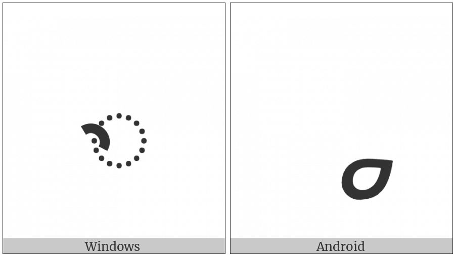 The image below shows how the “Kharoshthi Vowel Sign U” symbol might look like on different operating systems. If the font in which this web site is displayed does not contain the symbol and there is no fallback font able to render it, you can use the image below to get an idea of what it should look like.