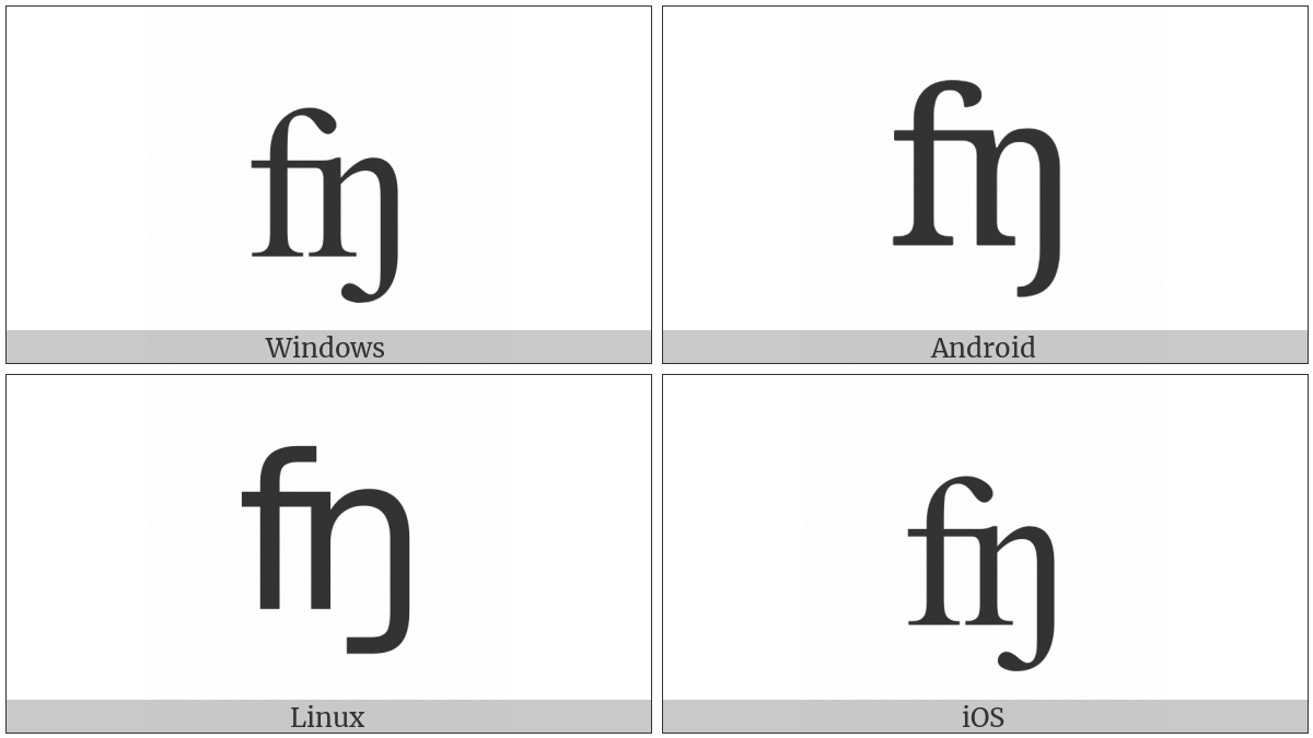 The image below shows how the “Latin Small Letter Feng Digraph” symbol might look like on different operating systems. If the font in which this web site is displayed does not contain the symbol and there is no fallback font able to render it, you can use the image below to get an idea of what it should look like.