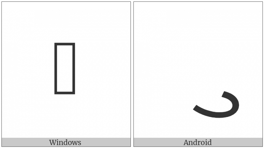 The image below shows how the “Kharoshthi Sign Anusvara” symbol might look like on different operating systems. If the font in which this web site is displayed does not contain the symbol and there is no fallback font able to render it, you can use the image below to get an idea of what it should look like.