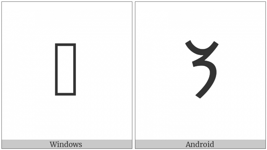 The image below shows how the “Kharoshthi Letter Ca” symbol might look like on different operating systems. If the font in which this web site is displayed does not contain the symbol and there is no fallback font able to render it, you can use the image below to get an idea of what it should look like.