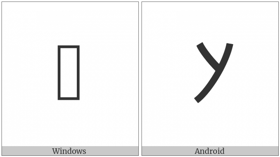 The image below shows how the “Kharoshthi Letter Ja” symbol might look like on different operating systems. If the font in which this web site is displayed does not contain the symbol and there is no fallback font able to render it, you can use the image below to get an idea of what it should look like.