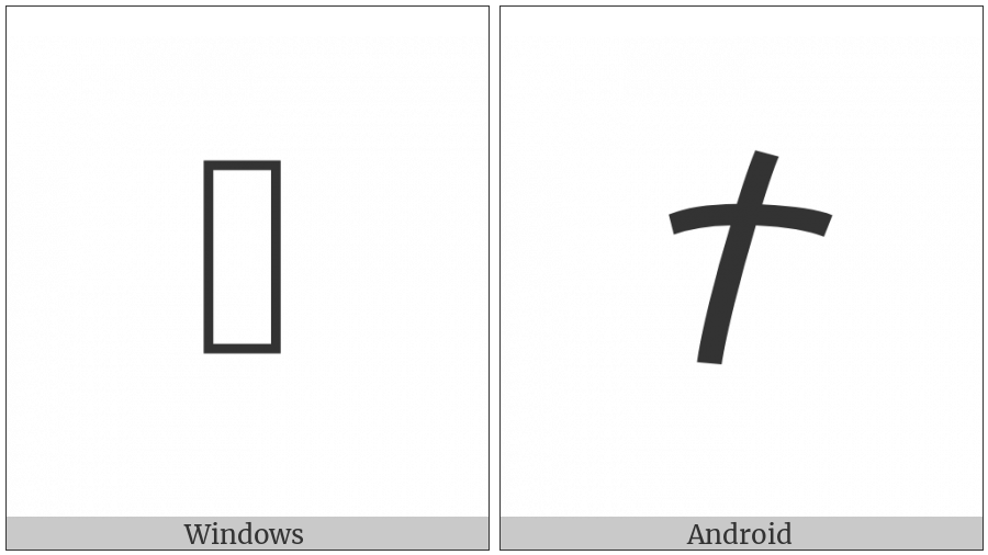 The image below shows how the “Kharoshthi Letter Tha” symbol might look like on different operating systems. If the font in which this web site is displayed does not contain the symbol and there is no fallback font able to render it, you can use the image below to get an idea of what it should look like.