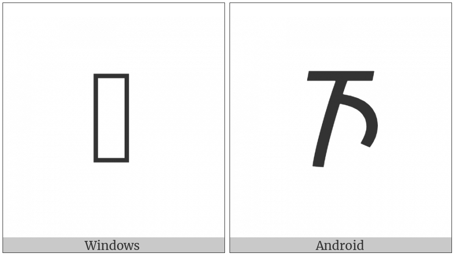 The image below shows how the “Kharoshthi Letter Bha” symbol might look like on different operating systems. If the font in which this web site is displayed does not contain the symbol and there is no fallback font able to render it, you can use the image below to get an idea of what it should look like.