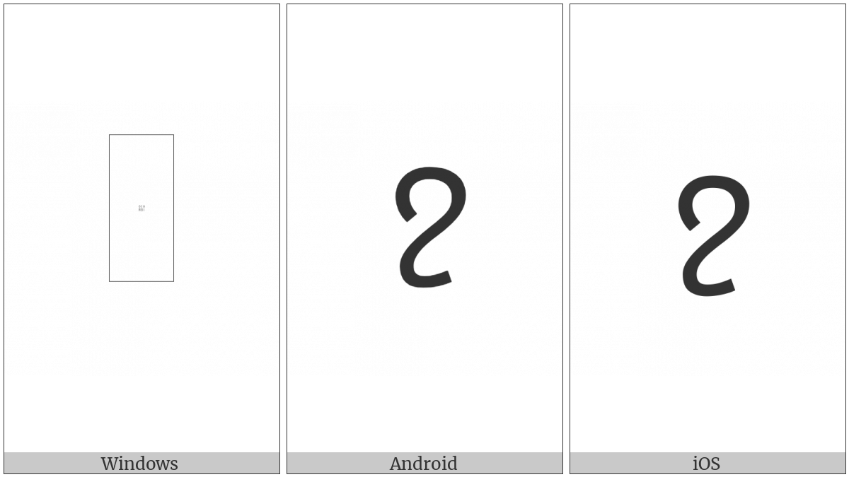 The image below shows how the “Kharoshthi Letter Ha” symbol might look like on different operating systems. If the font in which this web site is displayed does not contain the symbol and there is no fallback font able to render it, you can use the image below to get an idea of what it should look like.