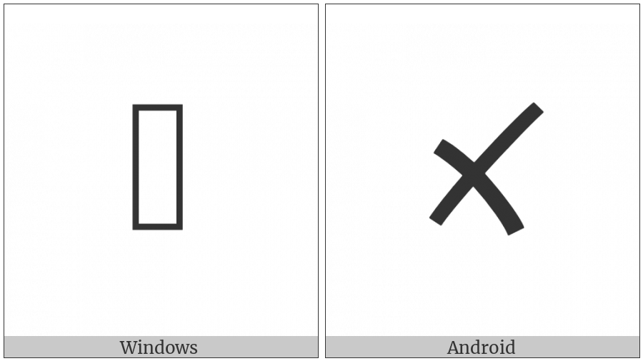 The image below shows how the “Kharoshthi Digit Four” symbol might look like on different operating systems. If the font in which this web site is displayed does not contain the symbol and there is no fallback font able to render it, you can use the image below to get an idea of what it should look like.