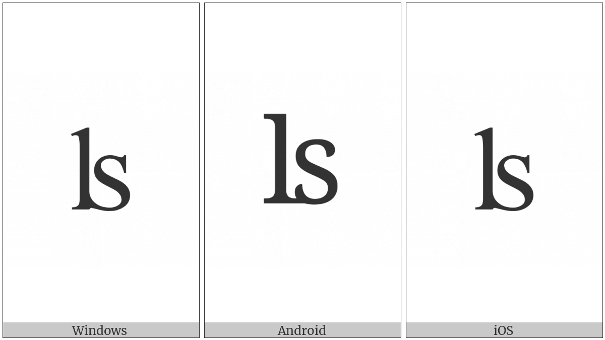 The image below shows how the “Latin Small Letter Ls Digraph” symbol might look like on different operating systems. If the font in which this web site is displayed does not contain the symbol and there is no fallback font able to render it, you can use the image below to get an idea of what it should look like.