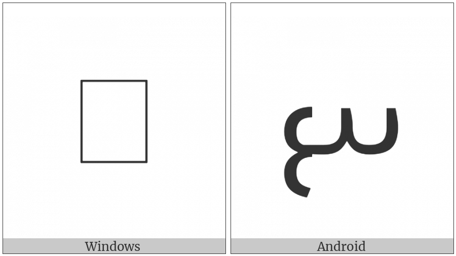 The image below shows how the “Avestan Letter Ao” symbol might look like on different operating systems. If the font in which this web site is displayed does not contain the symbol and there is no fallback font able to render it, you can use the image below to get an idea of what it should look like.