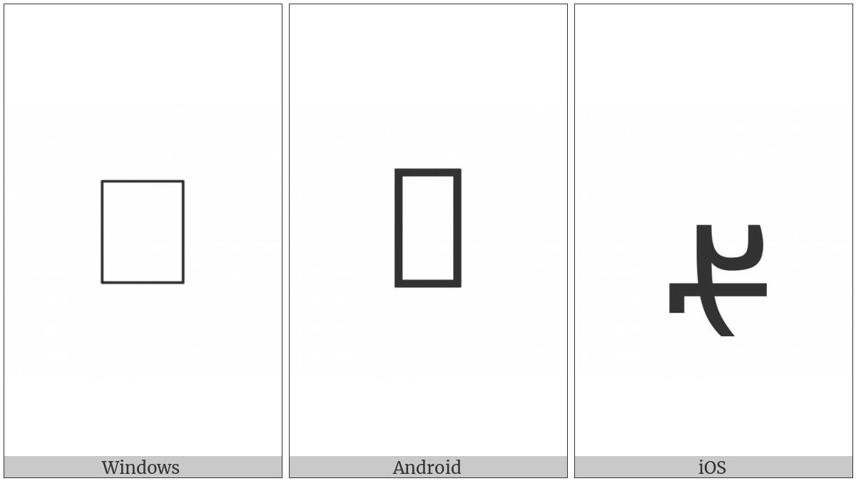The image below shows how the “Avestan Letter Aan” symbol might look like on different operating systems. If the font in which this web site is displayed does not contain the symbol and there is no fallback font able to render it, you can use the image below to get an idea of what it should look like.