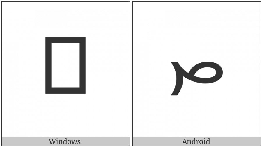 The image below shows how the “Avestan Letter Te” symbol might look like on different operating systems. If the font in which this web site is displayed does not contain the symbol and there is no fallback font able to render it, you can use the image below to get an idea of what it should look like.