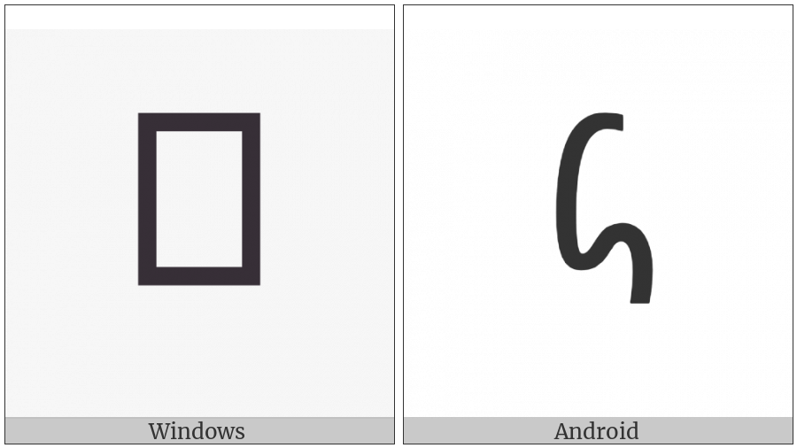 The image below shows how the “Avestan Letter Dhe” symbol might look like on different operating systems. If the font in which this web site is displayed does not contain the symbol and there is no fallback font able to render it, you can use the image below to get an idea of what it should look like.