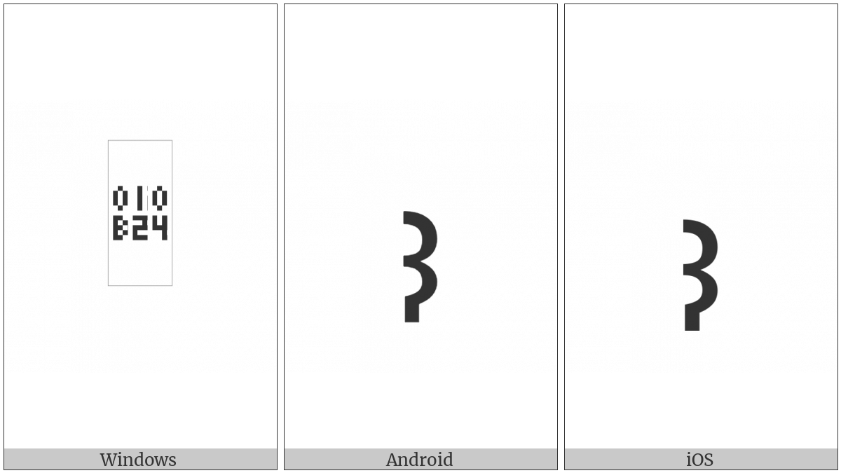 The image below shows how the “Avestan Letter Ngve” symbol might look like on different operating systems. If the font in which this web site is displayed does not contain the symbol and there is no fallback font able to render it, you can use the image below to get an idea of what it should look like.