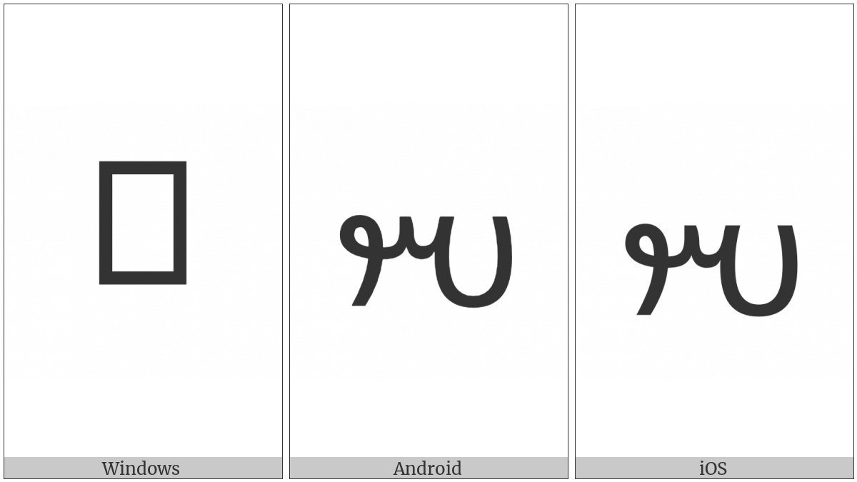 The image below shows how the “Avestan Letter Shye” symbol might look like on different operating systems. If the font in which this web site is displayed does not contain the symbol and there is no fallback font able to render it, you can use the image below to get an idea of what it should look like.