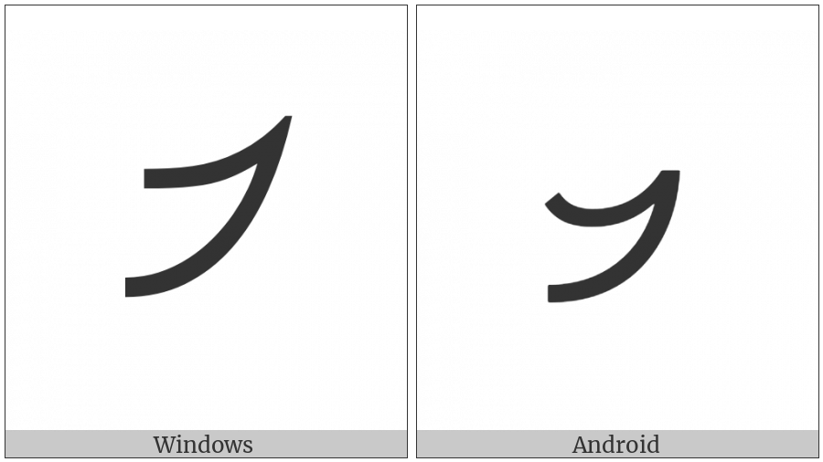 The image below shows how the “Inscriptional Parthian Letter Gimel” symbol might look like on different operating systems. If the font in which this web site is displayed does not contain the symbol and there is no fallback font able to render it, you can use the image below to get an idea of what it should look like.