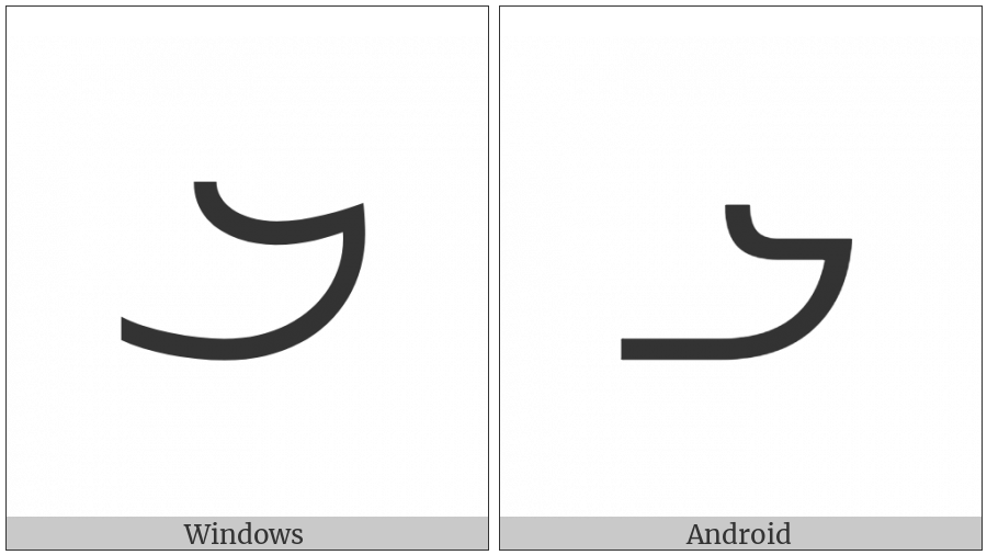 The image below shows how the “Inscriptional Parthian Letter Kaph” symbol might look like on different operating systems. If the font in which this web site is displayed does not contain the symbol and there is no fallback font able to render it, you can use the image below to get an idea of what it should look like.