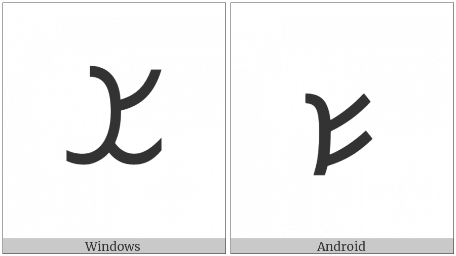 The image below shows how the “Inscriptional Parthian Letter Shin” symbol might look like on different operating systems. If the font in which this web site is displayed does not contain the symbol and there is no fallback font able to render it, you can use the image below to get an idea of what it should look like.