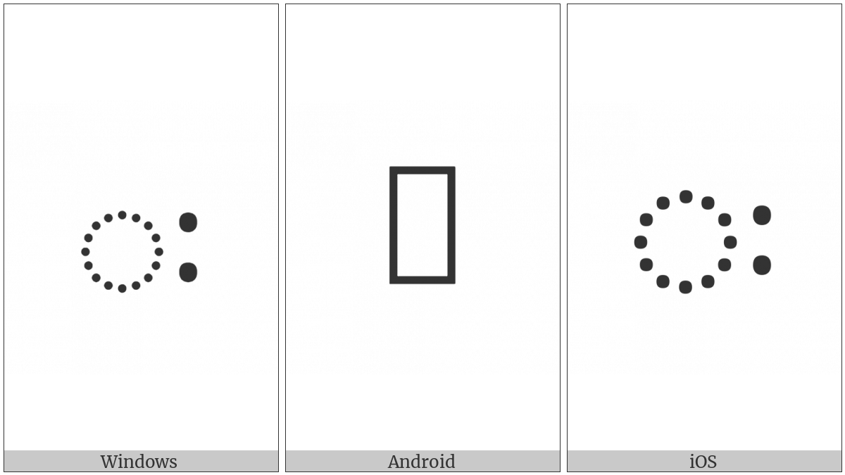 The image below shows how the “Kaithi Sign Visarga” symbol might look like on different operating systems. If the font in which this web site is displayed does not contain the symbol and there is no fallback font able to render it, you can use the image below to get an idea of what it should look like.